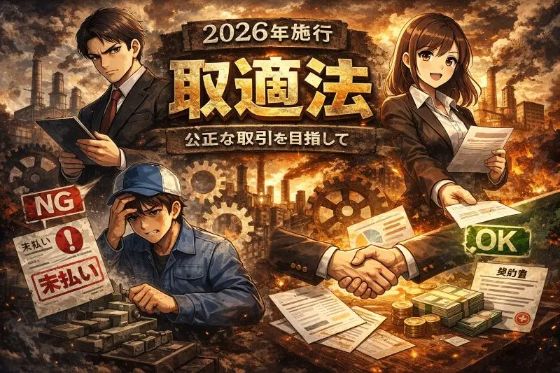 2026年1月1日から、これまでの「下請法(下請代金支払遅延等防止法)」は改正され、通称 「取適法(とりてきほう)」 として施行されました。法律名・用語の見直しだけでなく、規制対象の拡大や禁止行為の追加、さらに執行体制の強化まで含む大きな改正です。
